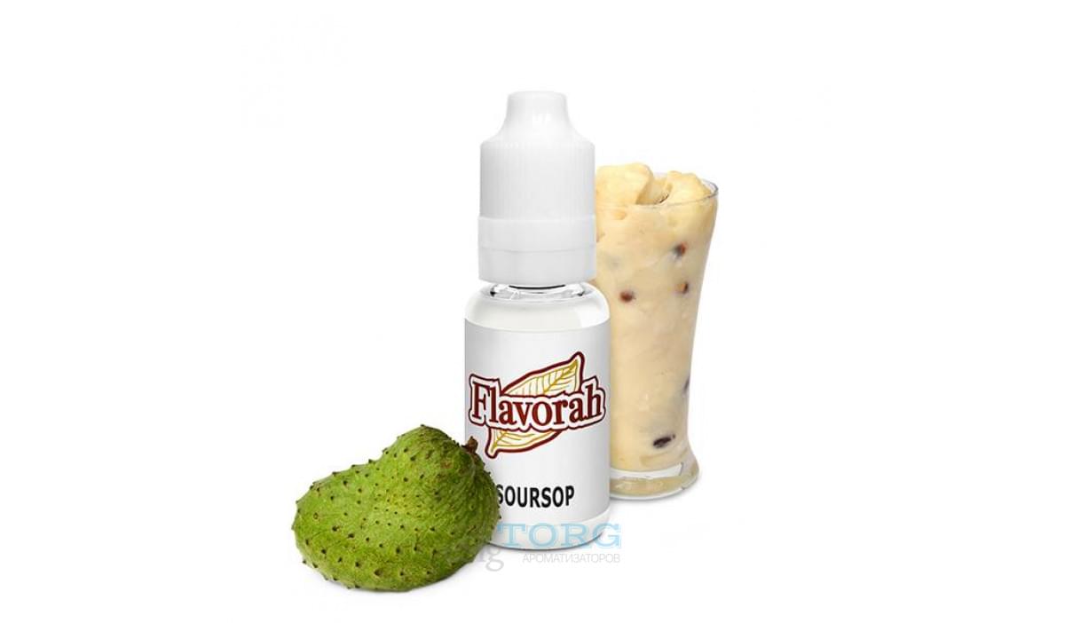 Soursop Flavorah — тропическое сметанное яблоко. Этот популярный в Америке и Юго-Восточной Азии фрукт похож на гуанабану и черимойю. По вкусу он, действительно, напоминает яблоко, с оттенками дыни и цитрусовых. На заднем плане: кокос, банан, вишня, клубника. Насыщенный, богатый аромат! Запаривать Soursop следует в пропорции от 0,2 до 1,8% (в рецептах).